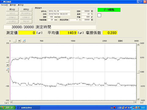 ・一定の負荷(圧力)を掛けた状態で、試料を往復運動させ、その時の摩擦係数μの変化をグラフ表示する事が出来ます。